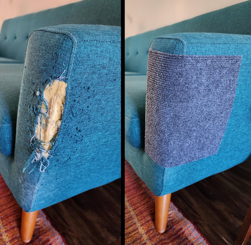 Used this product on a teal couch. Looks better with the damage covered of course. Seems sticky enough as well to stay hold! My boy didn't notice my trick and keeps on scratching on the pad! Thank you!Elma H. Martinez