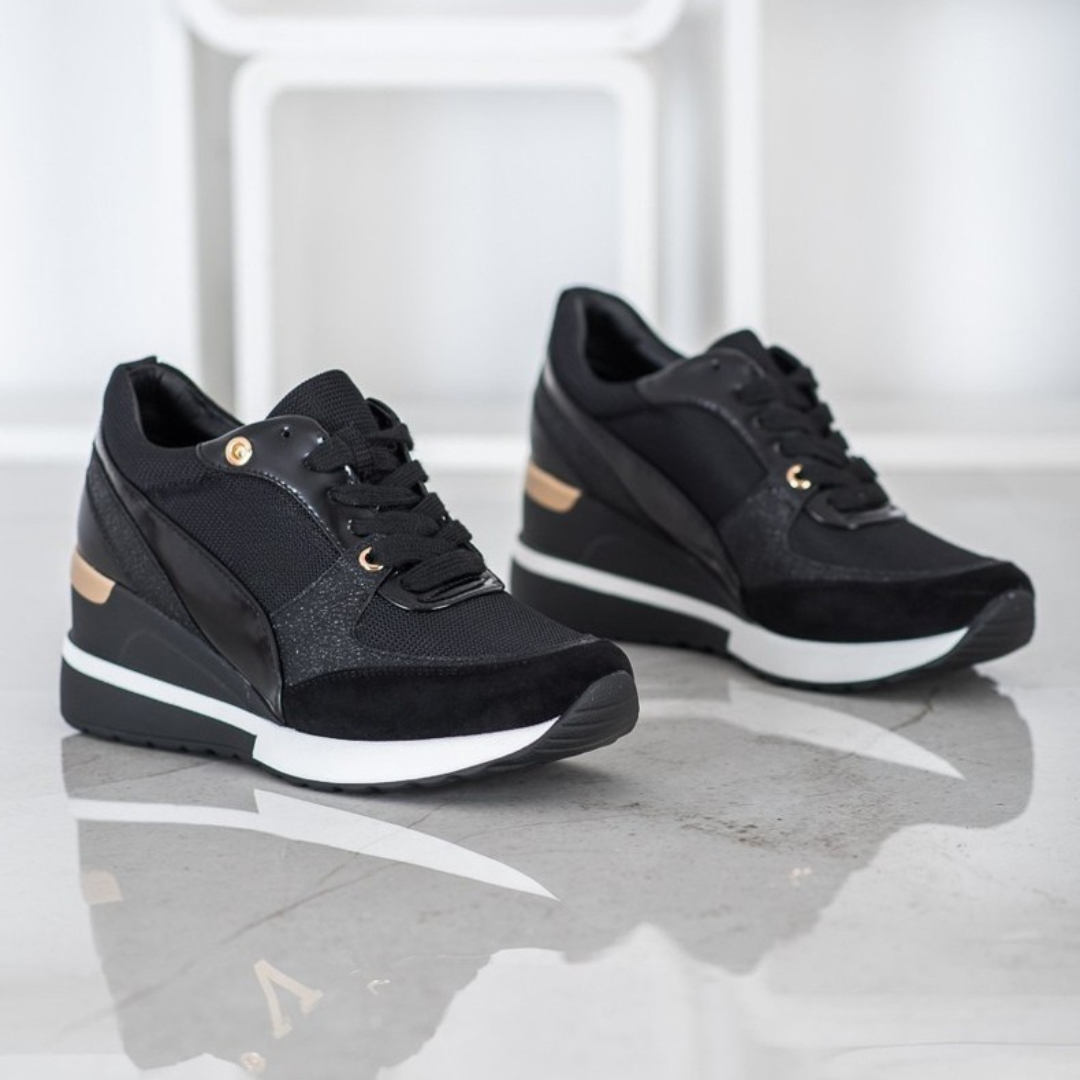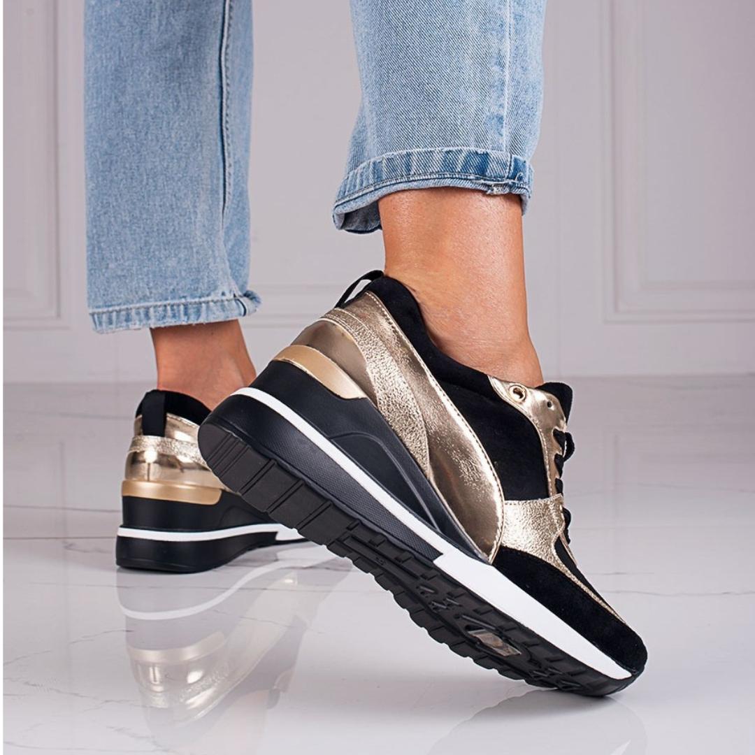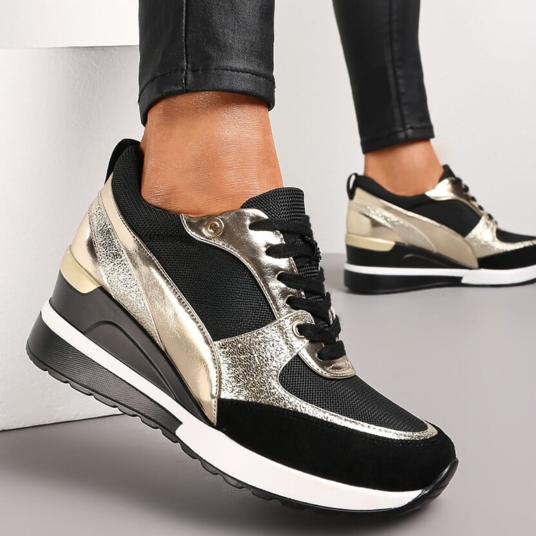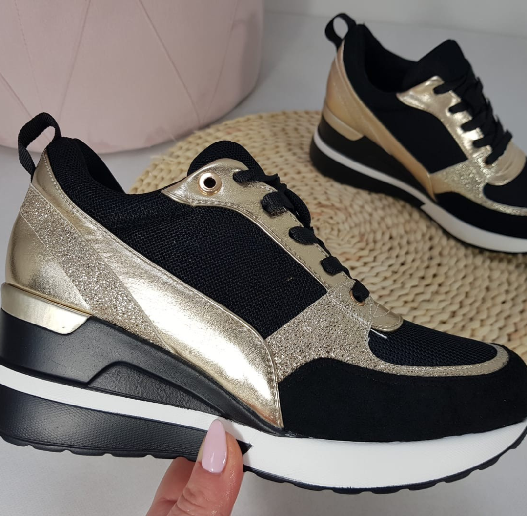 Faites la différence avec ces sneakers à plateforme scintillantes, élégantes et modernes. Leur design raffiné avec détails dorés apporte une touche luxueuse à vos tenues, tout en offrant un confort exceptionnel grâce à leur tissu respirant qui épouse parfaitement la forme du pied